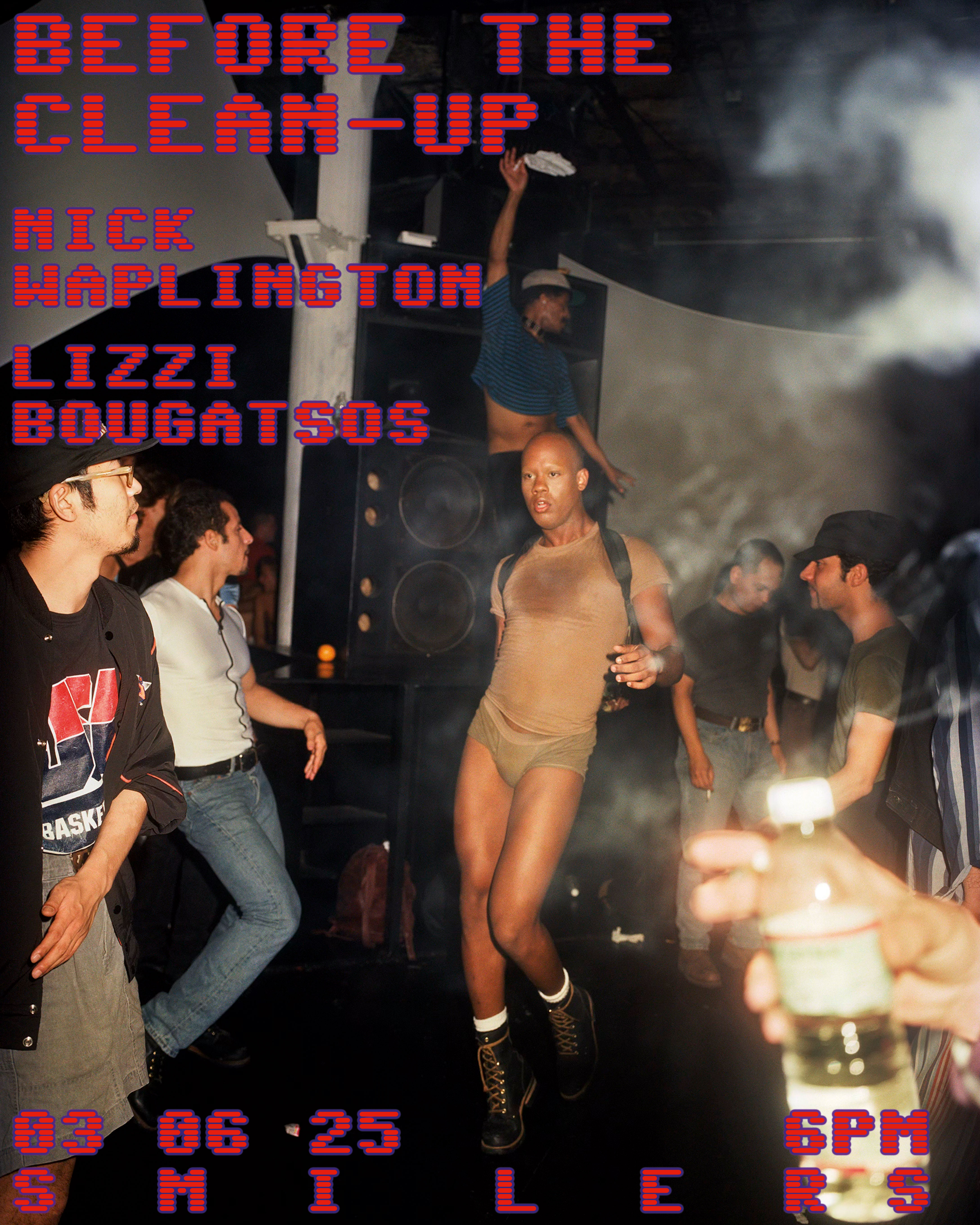 S M I L E R S, in its East Village basement, honors the legacy and persistence of the New York City club scene in its second exhibition—BEFORE THE CLEAN-UP. Nick Waplington and Lizzi Bougatsos coexist as foils in this exploration of a clandestine, oft-mythologized subculture—both participants but playing radically different roles, with Bougatsos channeling a range of active subjects and Waplington as one of the few documentarians given access to a thriving 1990s underground ecosystem. Waplington’s photographs from the era are energized through Bougatsos’s improvisational sculptural elements, some likened to the items—and reticence—one sheds as the night takes over.