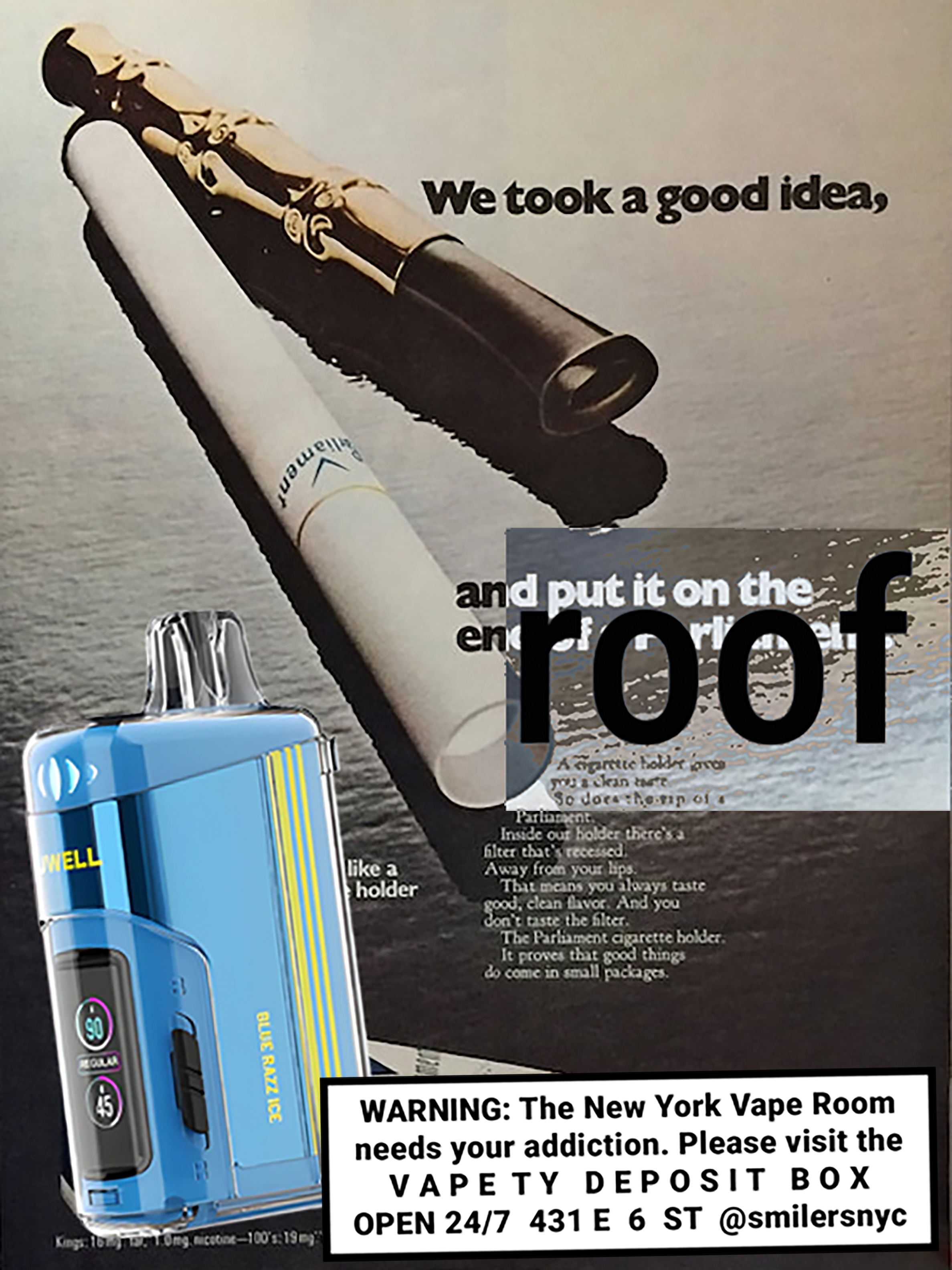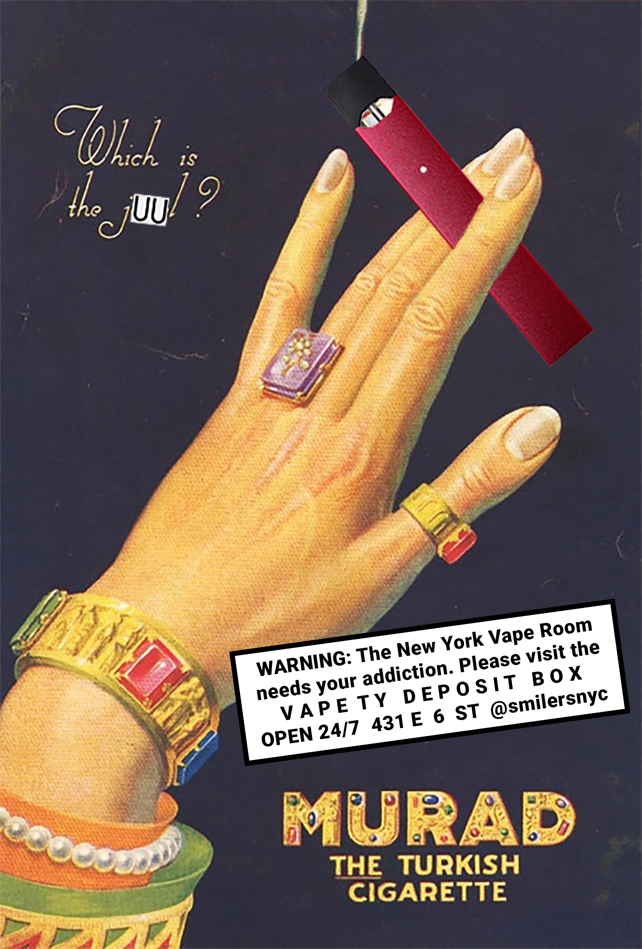 INXS, a sculpture is readily made of indulgent Gen Y+Z garbage, digital+actual. Look out for printed posters [and discarded vapes] around the city that favor fruity packaging and crudely riff on the visual language of classic cigarette ads. Virality is fleeting and can be insincere; social media engagement as a tool will be secondary. Artificially wrought, shallow perhaps—the idea strengthens over time in natural discourse, rising in tandem with the ⊹measured⊹ “depth” of the vape pit. The project re-employs extractive materials and is maximally modest in size. The New York Vape Room exists partially in the realm of the intellect, with its physical self incomplete—ever spoo/ling/fing/king ;)